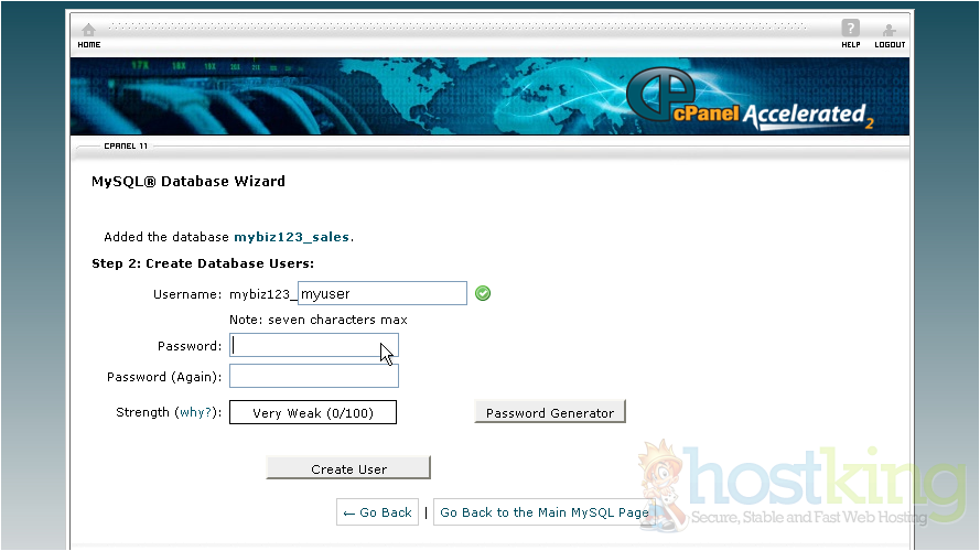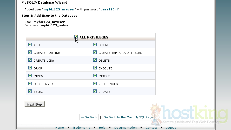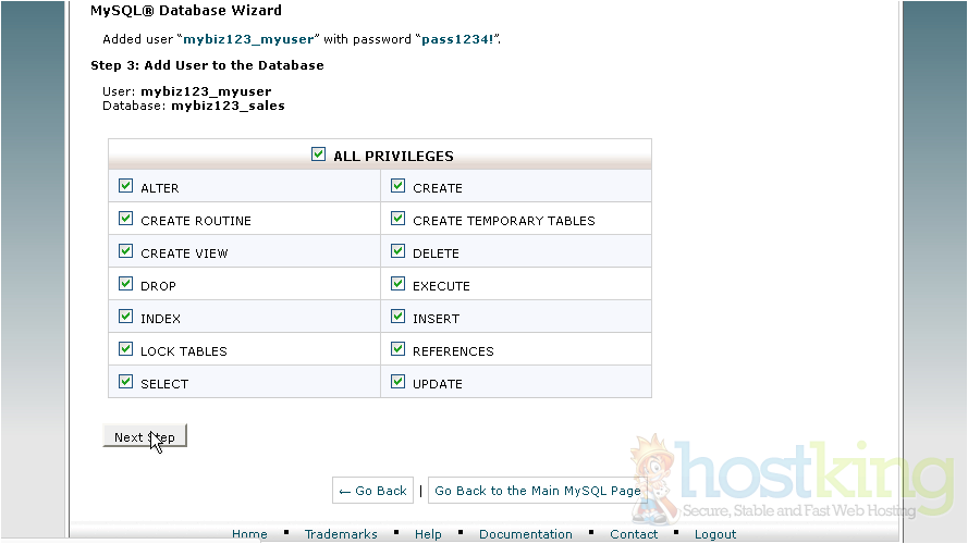 That's it! The MySQL database has been created, and the new user added to the database. The database name, username and password will all be needed for scripts that need to connect to the database