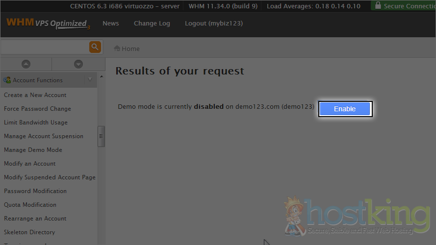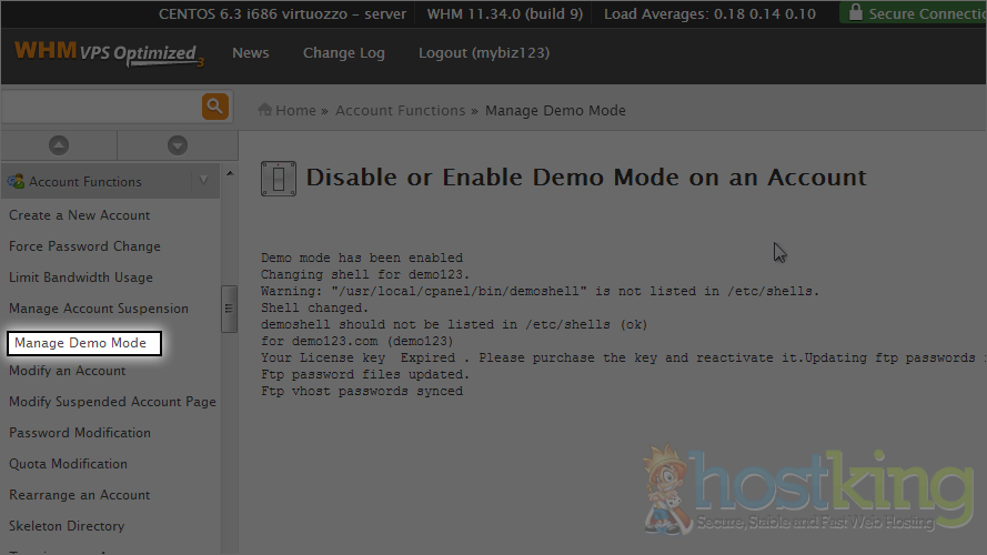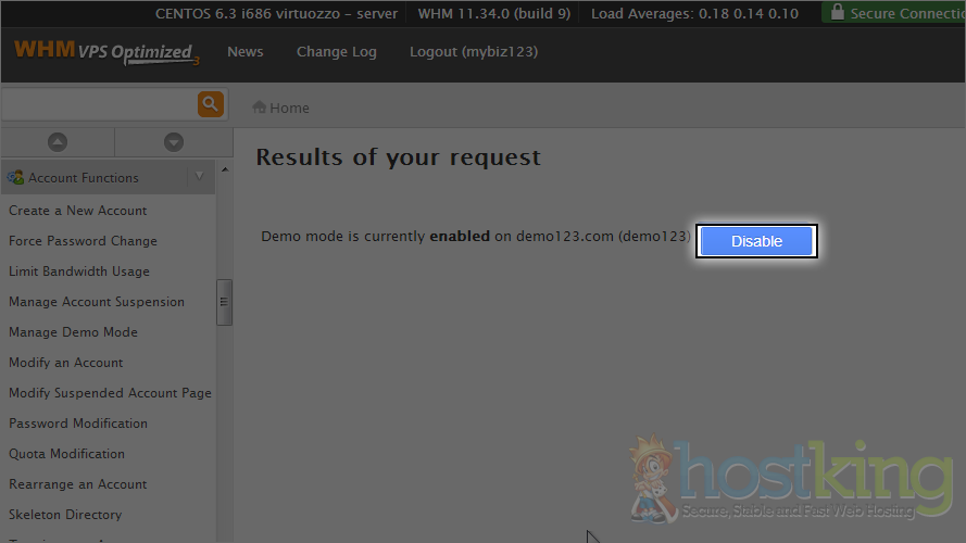 That's it! Demo mode has been enabled, meaning that when a user logs in to this account's cPanel, certain functions will be disabled.
