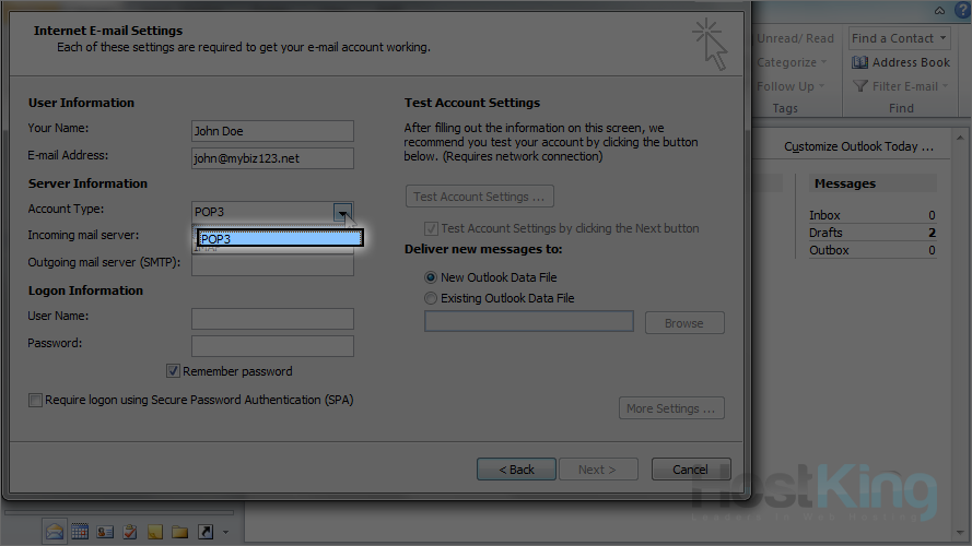 9) Ensure "POP3" is selected as the account type.
