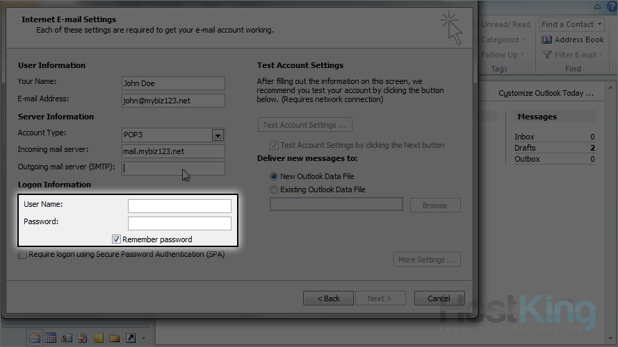 11) Enter your full email address as the user name, and the password.
