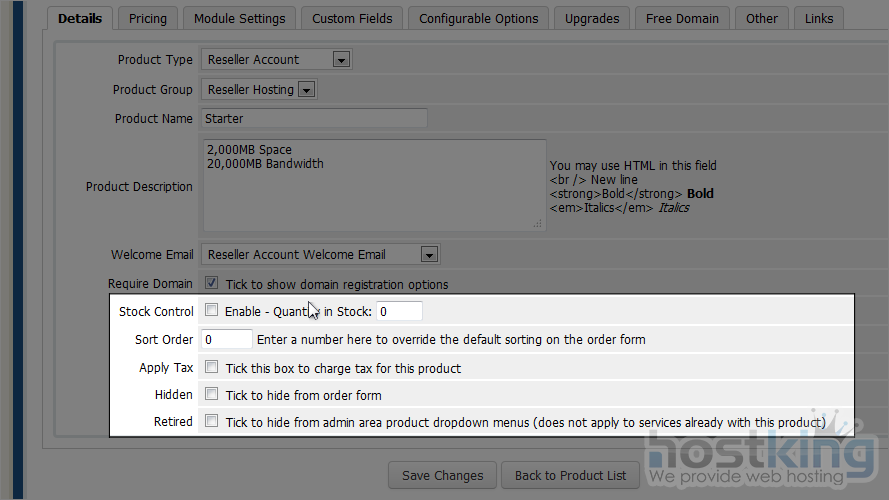 Other settings on this tab allow you to keep track of this product's stock, change its sort order, apply taxes or hide the product.