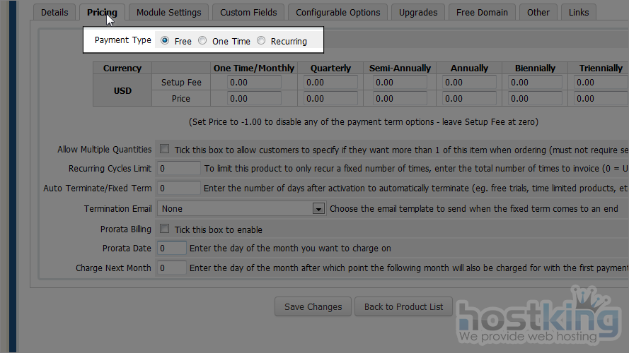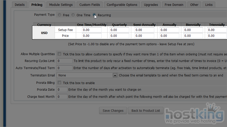 17) Then, fill in the setup fees if you want to and prices for every payment period under every currency. Note that a value of -1 will disable any of these payment terms.