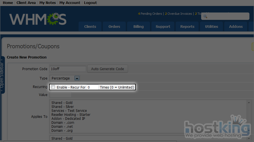 8) Select if this promotion is recurring. WHMCS 5 also give you option to set how many times recur should be occured.