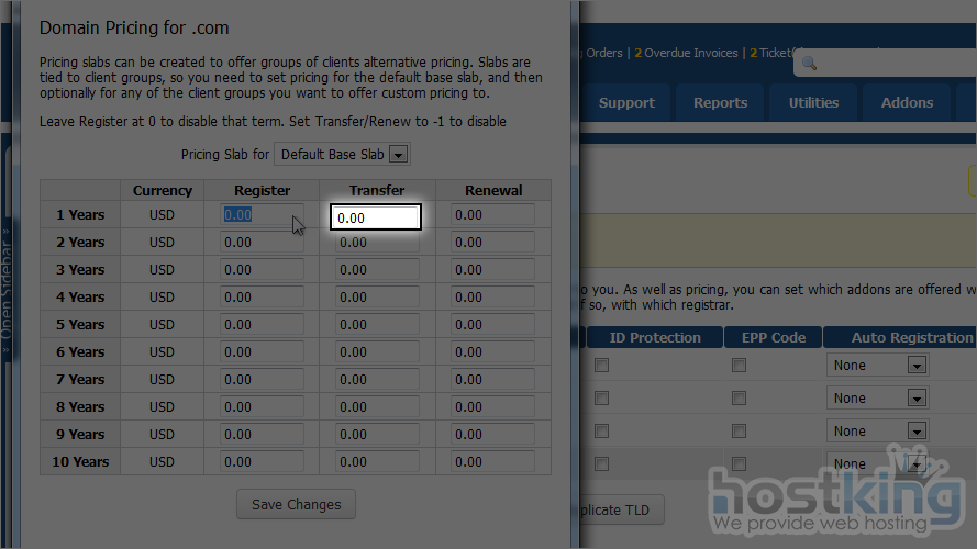 For each term you wish to offer the domains of this type, specify the price of registrations, transfers and renewals. Registrations can be left as 0 to disable everything for that term; the other two should be set as -1 to disable each.