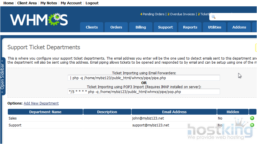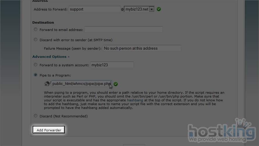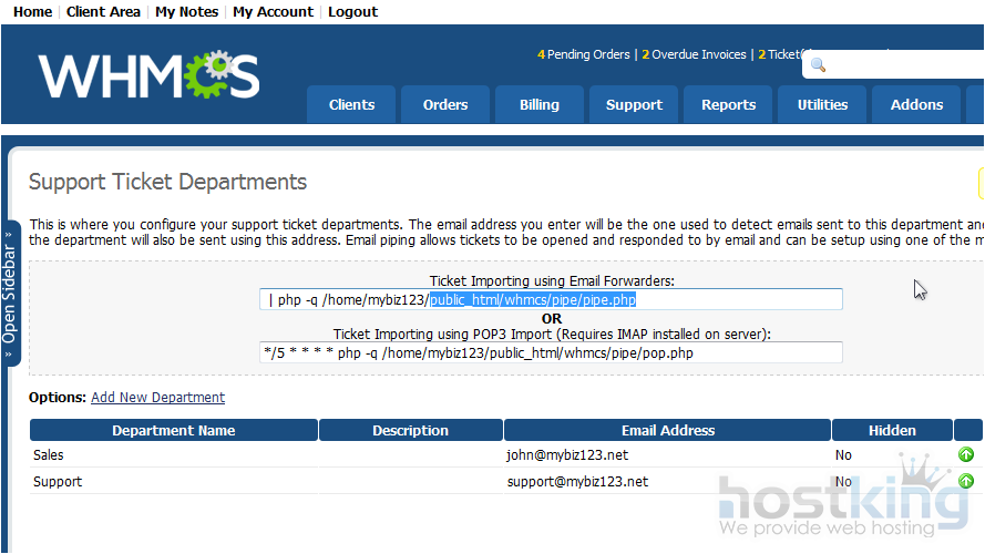 That's it! The e-mail forwarder has been set up to pipe support e-mails to WHMCS.