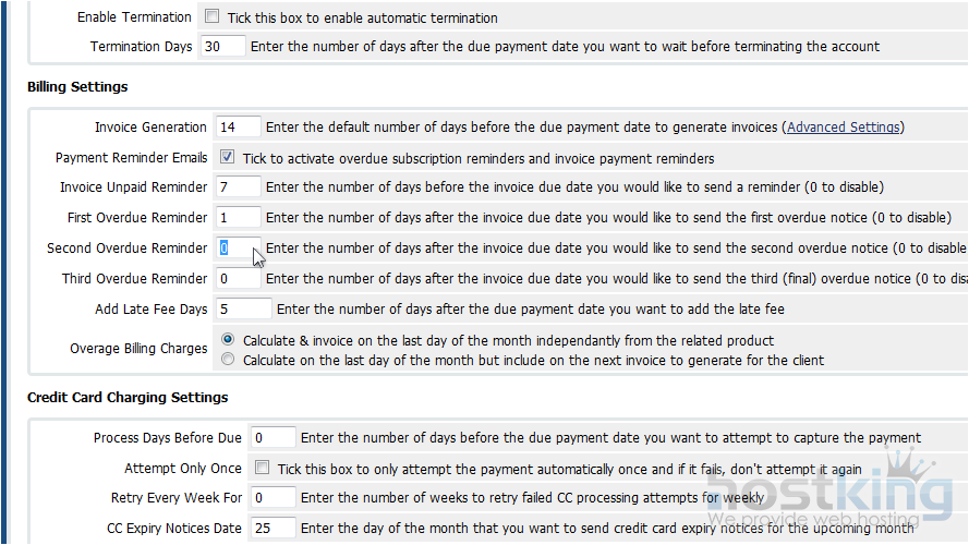 The first box of settings controls automatic account suspension and termination. Note that this will only function properly once WHMCS has been set up to work with your control panel(s).