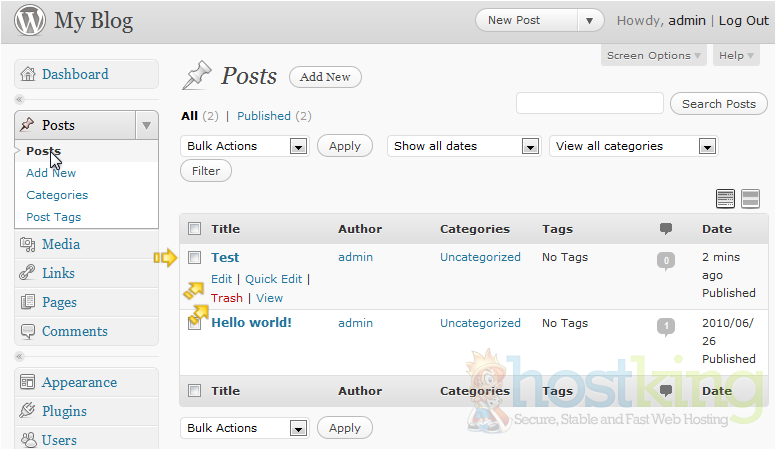 7) Go to Posts in the left sidebar. The new post shows up in the list here. You can now edit or delete it if you wish.