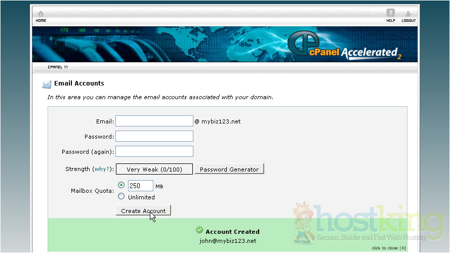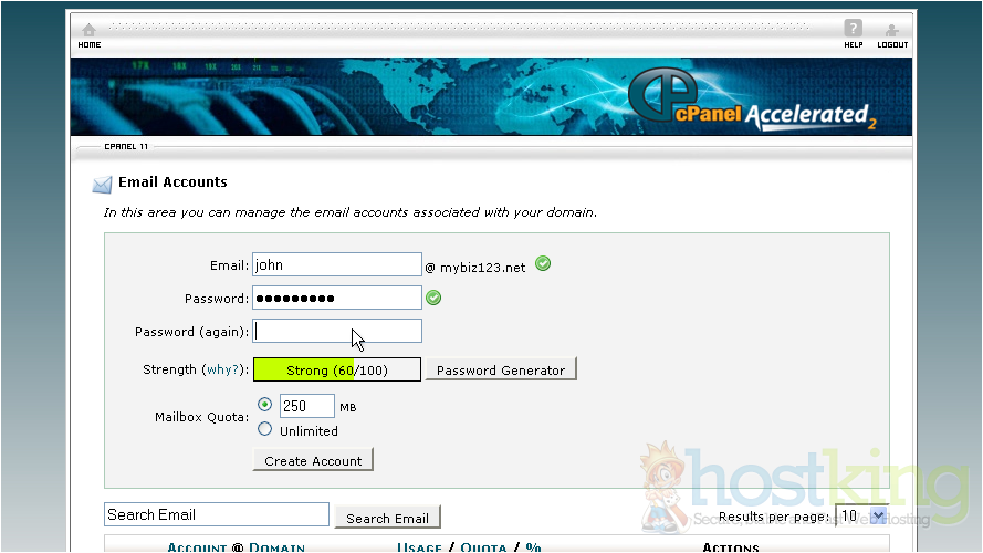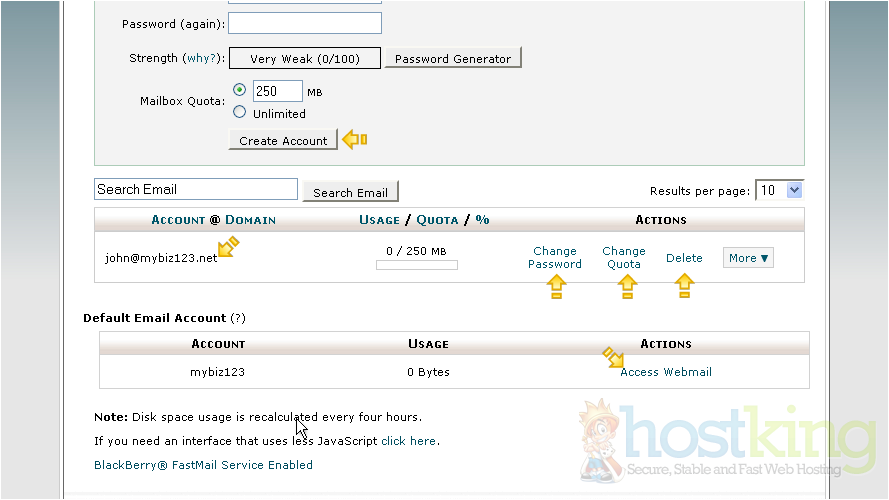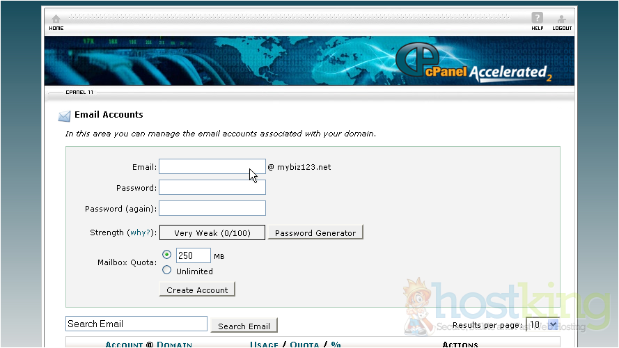 From here we can access web mail, change the email password, change the quota, or even delete the account. You can also create additional email accounts