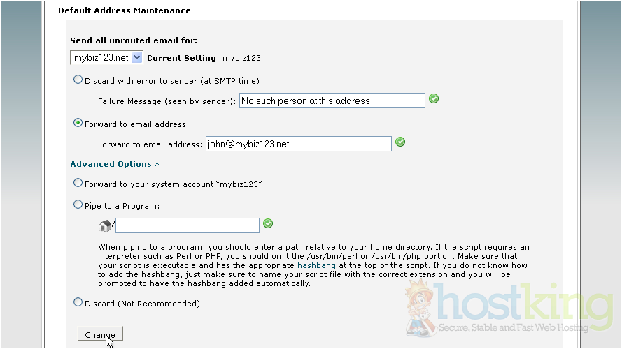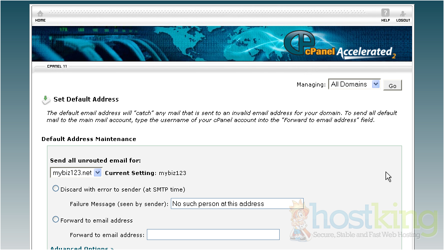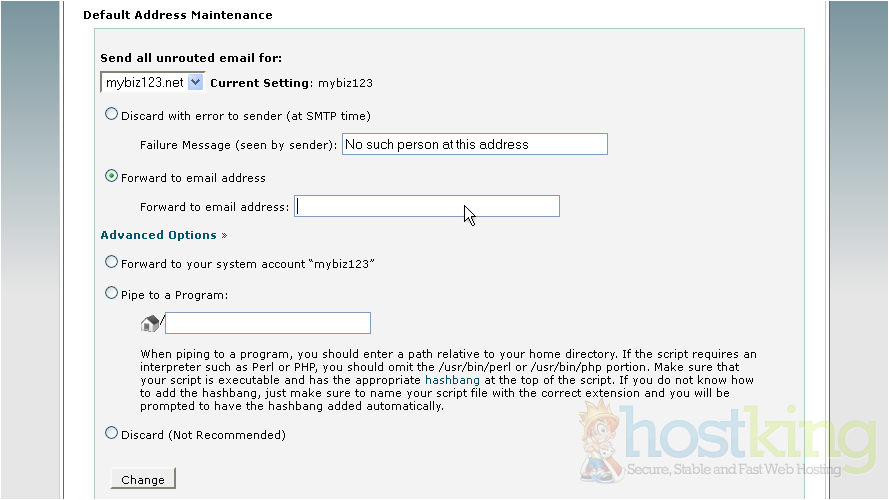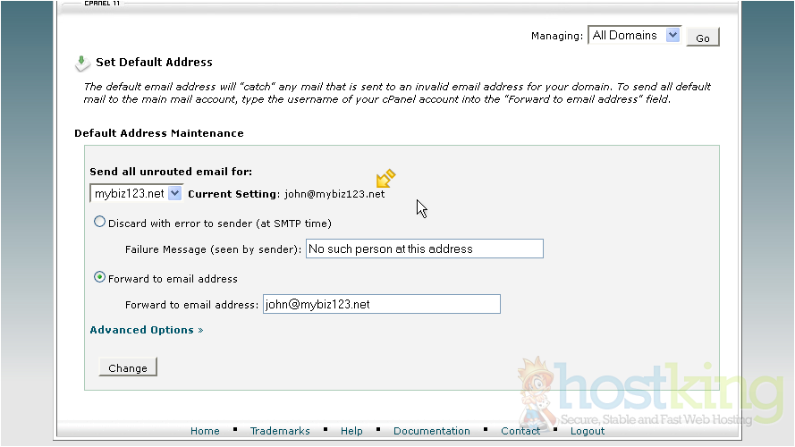 This is where you set your default address, so that all unrouted email... email sent to addresses you don't have setup... will have a place to go