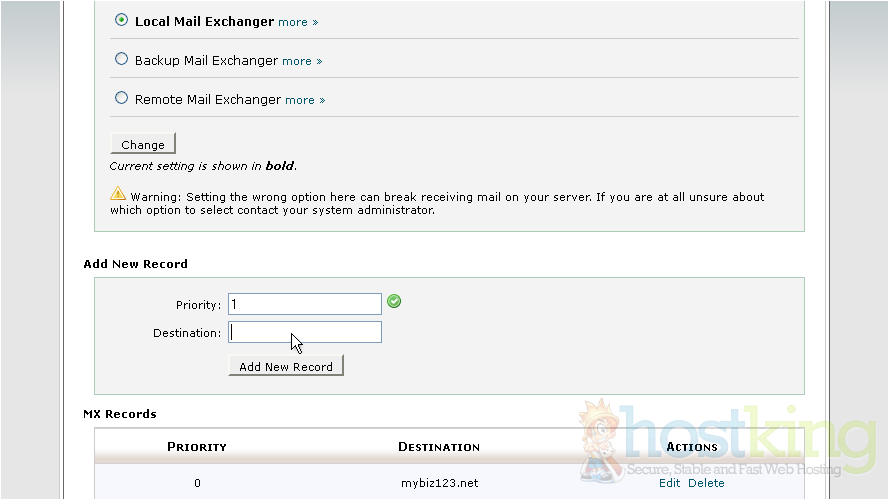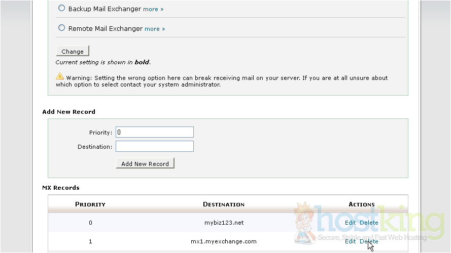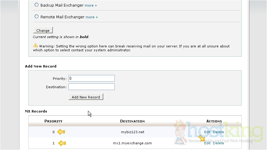 So in this case, the default mail.mybiz123.net mail server will be tried first because it has a priority of 0 followed by the new mail server mx1.myexchange.com, because it's priority number is set to 1. You can return to this page at any time to make changes to your MX entries and their priorities...