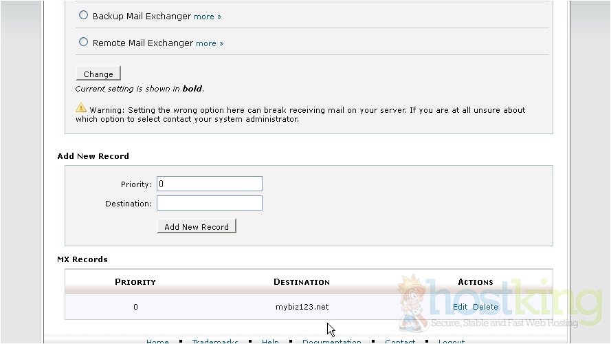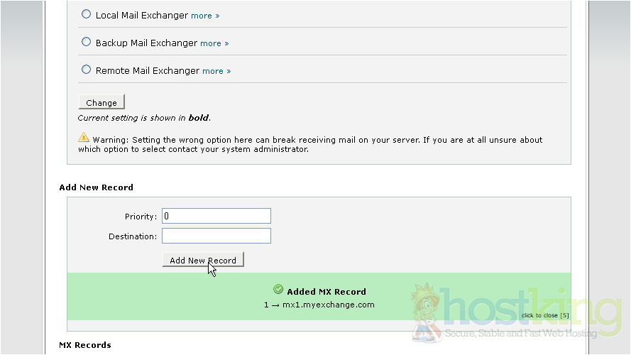 3) Then enter the new MX entry. Click Add New Record