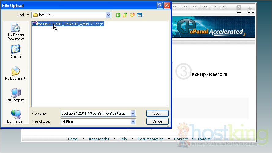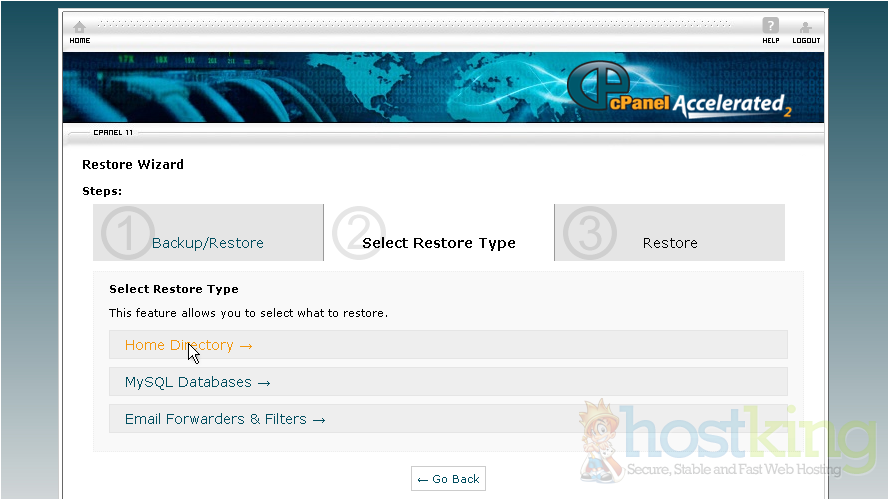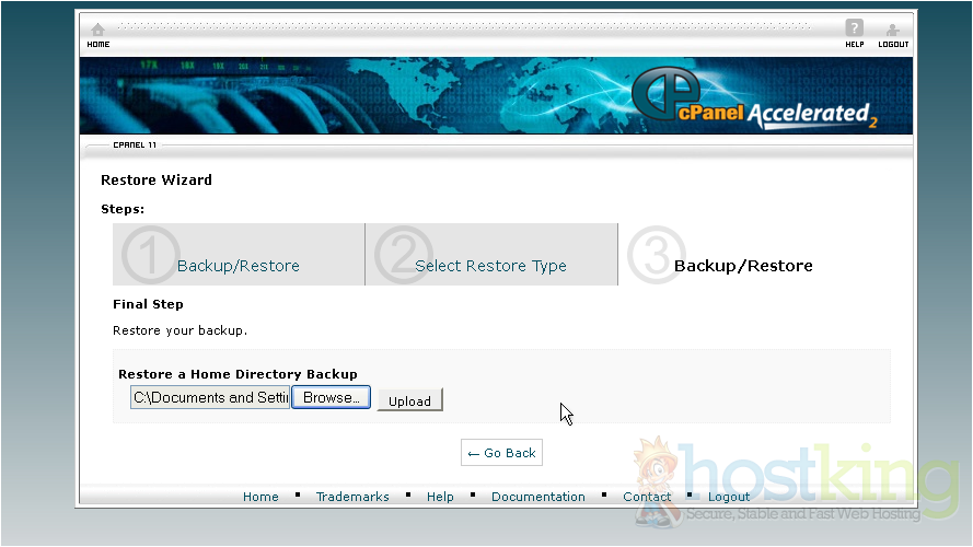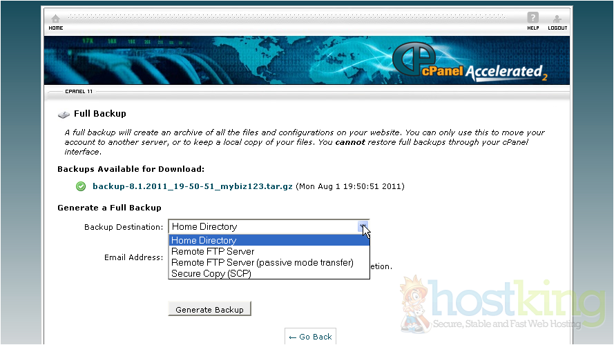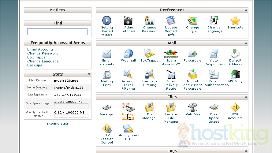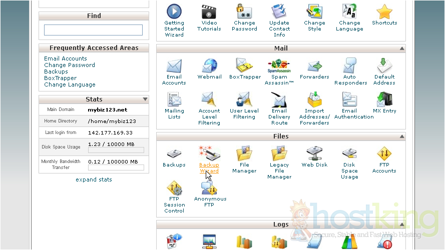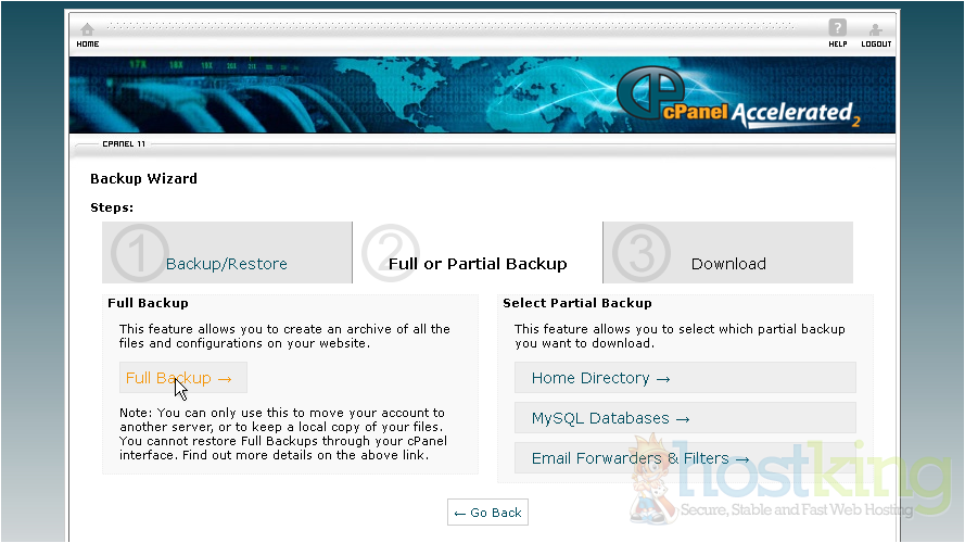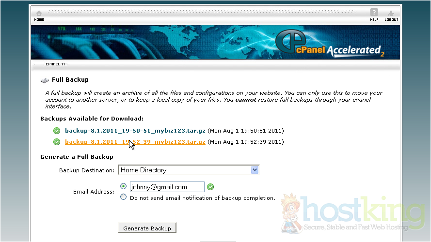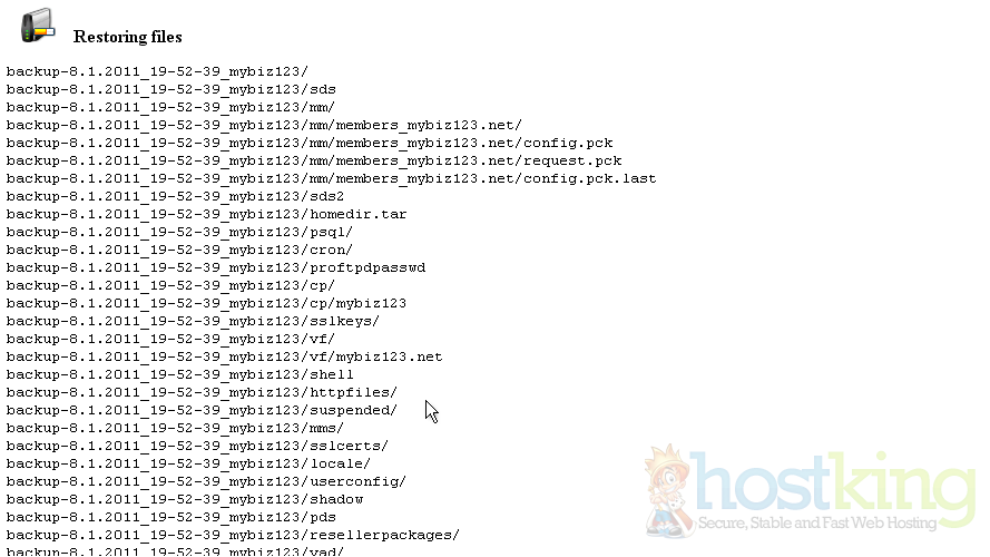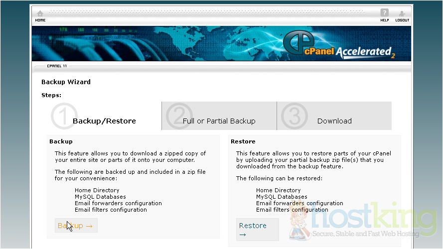 This is the main backup screen where you can backup, or restore the files in your hosting account.