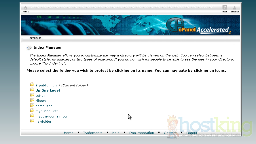 If there is no index.html file in a given directory, the contents of that directory will be displayed in a browser. This is typically undesireable, and can cause security issues. With Index Manager, you can set your account up to not allow your directory contents to be shown.