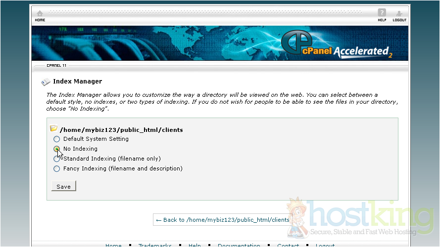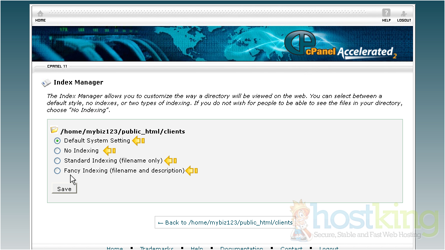 There are 4 settings to choose from: Default System Setting - allows the directory contents to be shown, No Indexing - does not allow directory contents to be shown, Standard Indexing (filename only) - Prevents browsers from viewing the contents of directories that do not contain image files, Fancying Indexing - Prevents browsers from viewing the contents of directories that do contain image files