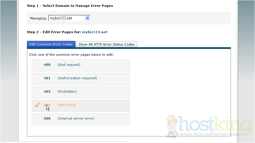 There are several different error pages you can customize. In this tutorial, we're going to customize the 404 error page