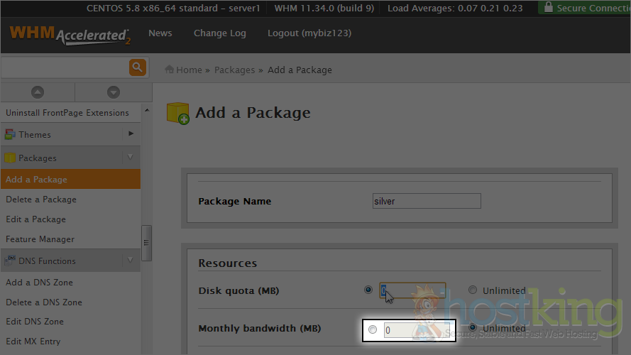 Note that space and bandwidth must be entered in megabytes (MB) and not gigabytes (GB). In this case we'll enter 10000MB in disk quota which is equal to 10GB.