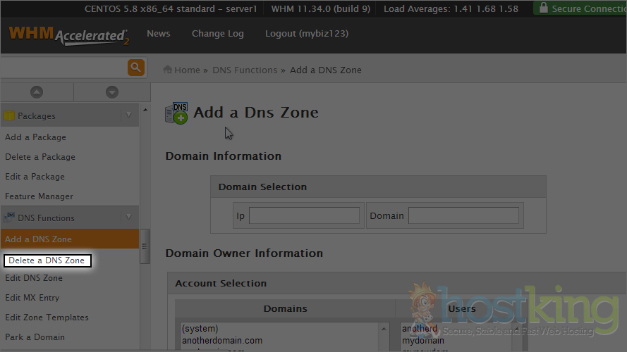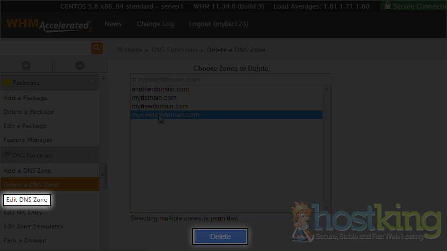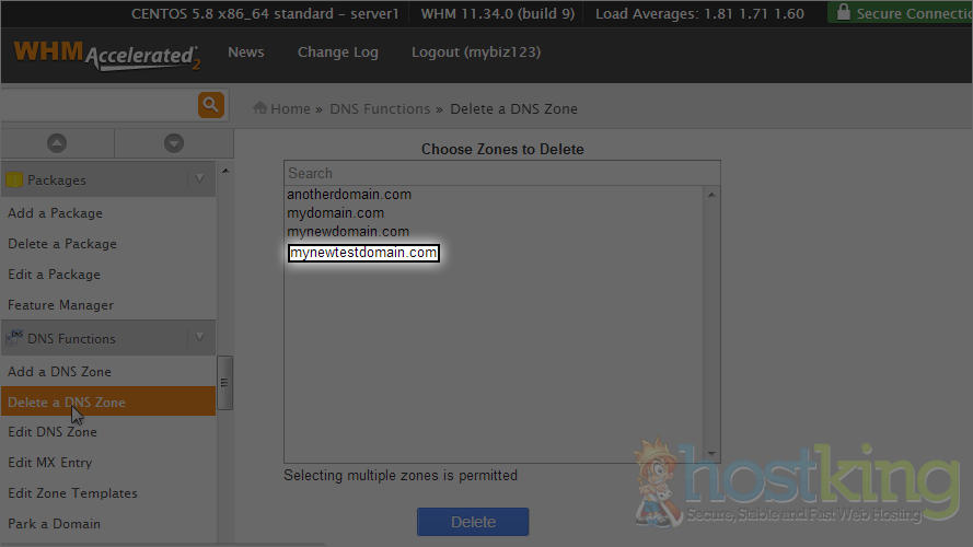 4) To delete the DNS zone for mynewtestdomain.com, select that account here.