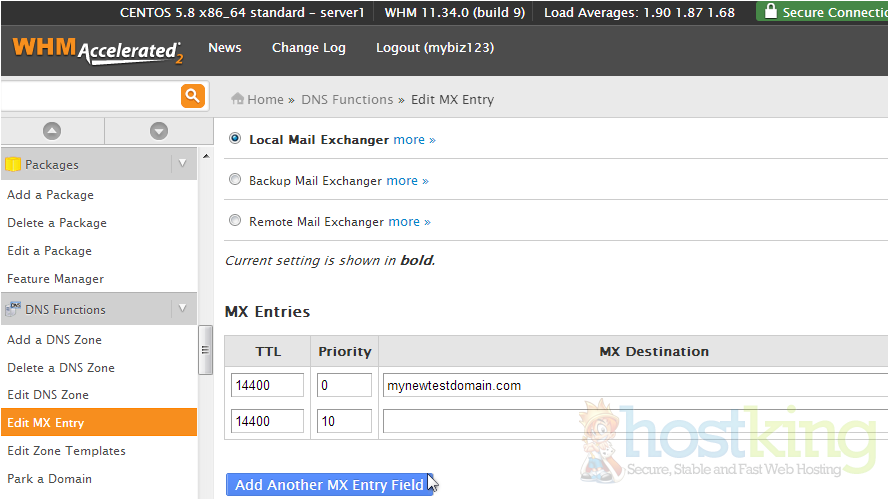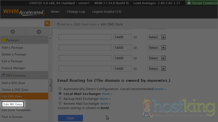 This is where you can specify a custom MX entry. You may want to do this for customers who want their email hosted elsewhere on another server. In those cases, you would enter the other server's IP address here and click save.
