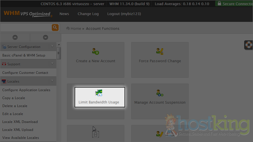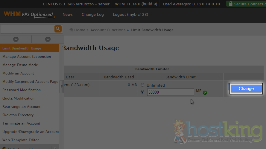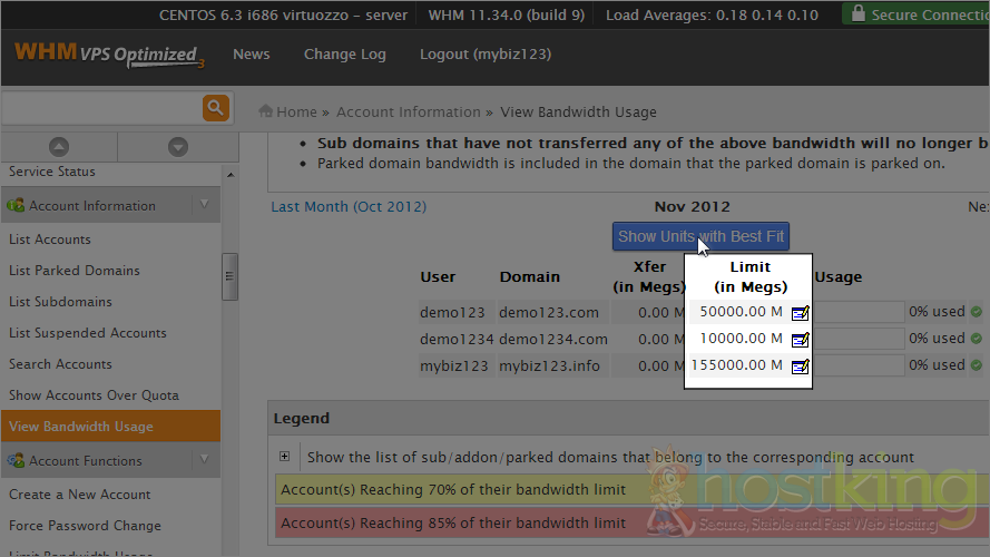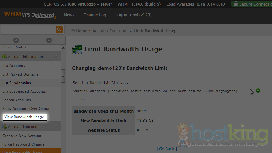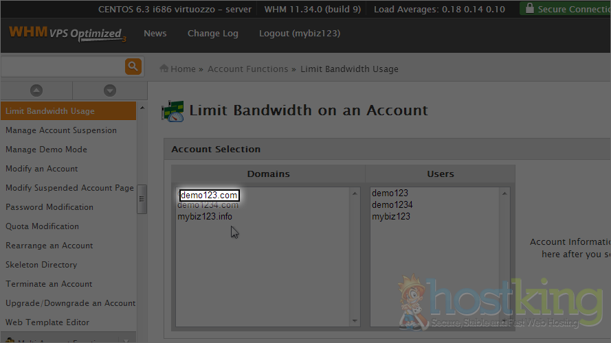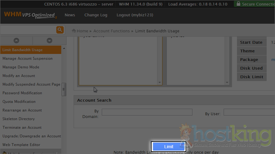 Let's go ahead and check the bandwidth limit on one of the listed hosted accounts.