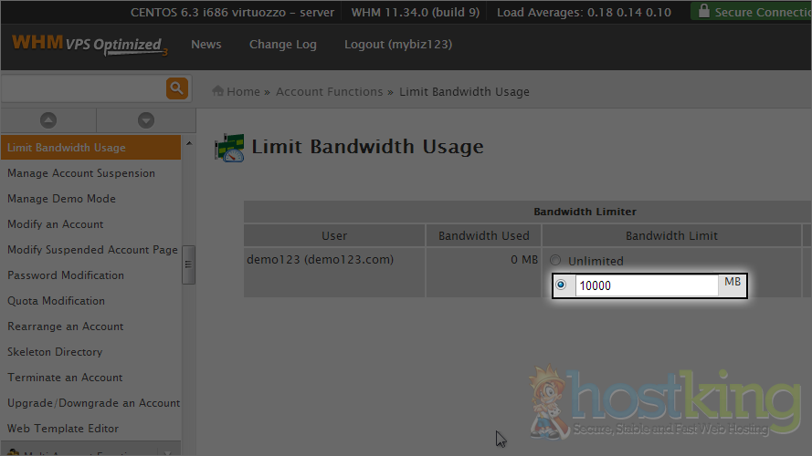 5) Let's go ahead and increase this account's bandwidth limit by typing in a new value here.