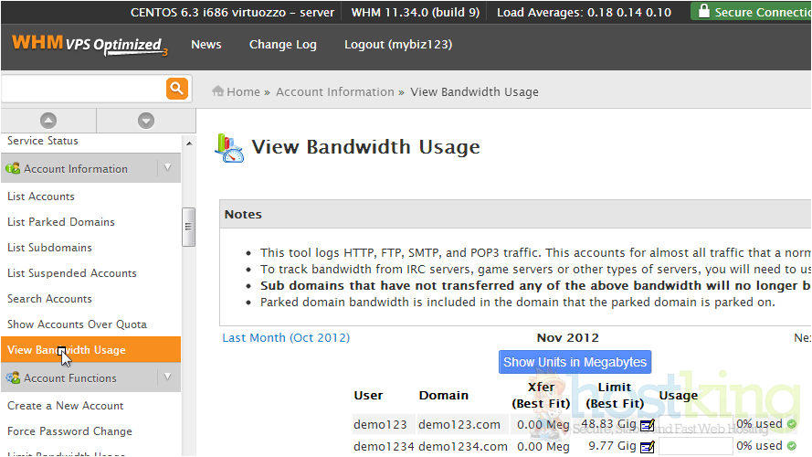 Here we can see that the demo123.com account has used 0 MB (or megabytes) of bandwidth.