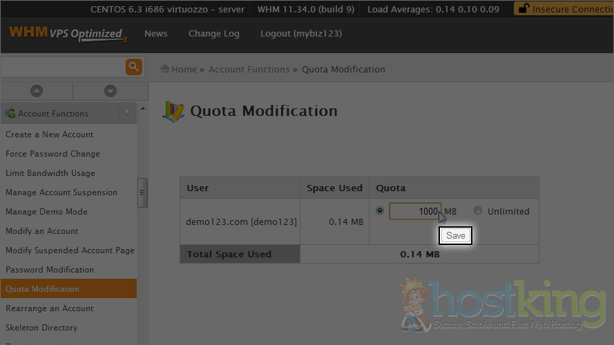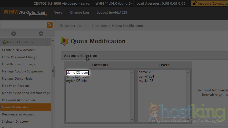 Let's go ahead and change the quota for the demo123.com hosting account.