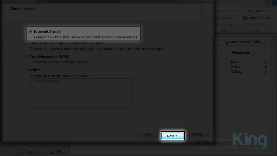 8) Ensure the "Internet E-mail" option is selected, then click "Next" again.