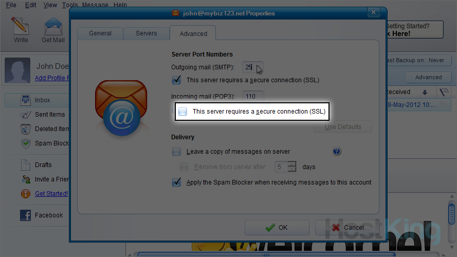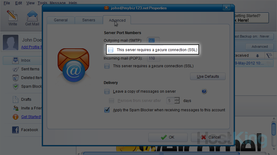 18) Click here to require a secure SSL connection for the outgoing server.