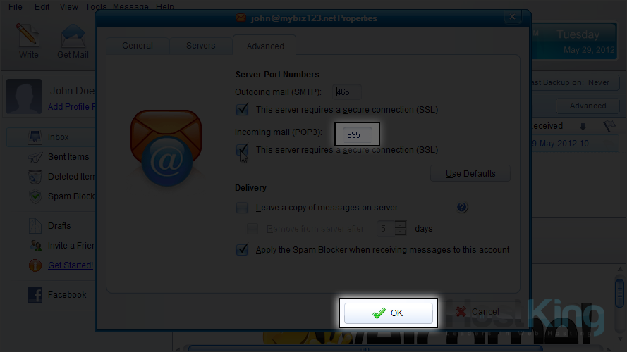 Note that by doing so the port number changed to 995, the default email port for SSL.