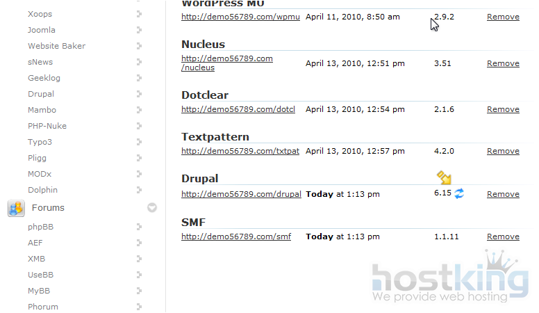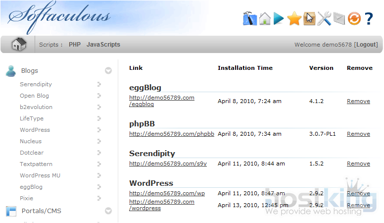 Here we can see which scripts are being managed by Softaculous, when they were installed, and the version. We can also remove a script.