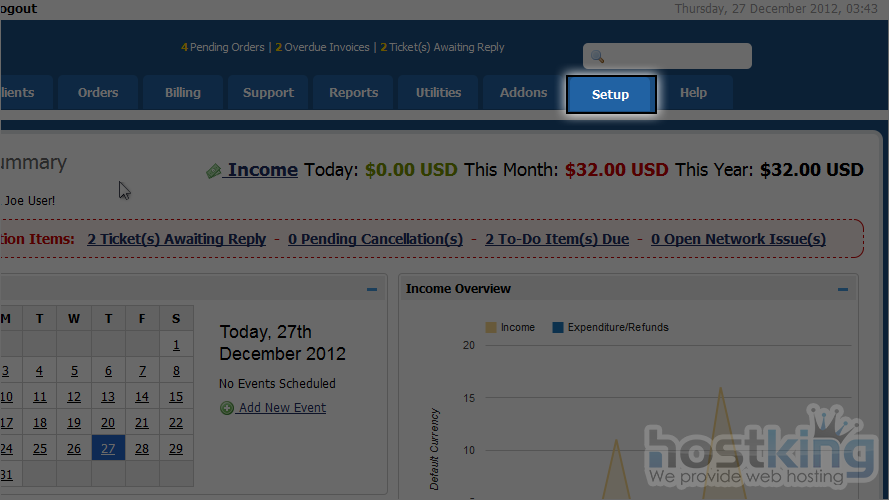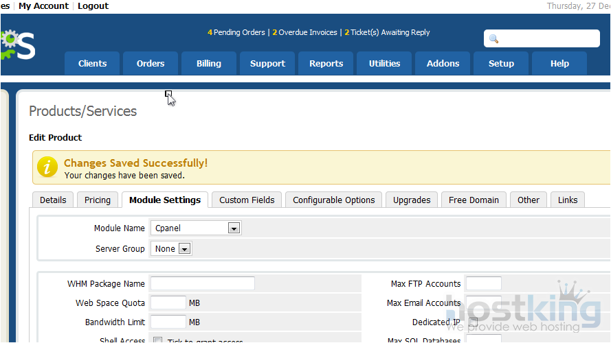 For details on the other control panel modules, check out the WHMCS documentation, accessible from the help menu.