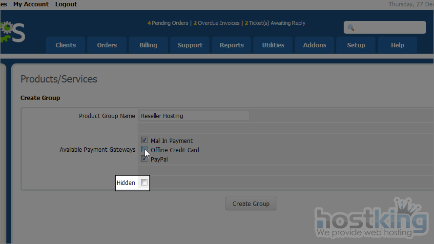 7) If you don't want this group to show up on the order pages, tick the checkbox next to hidden.