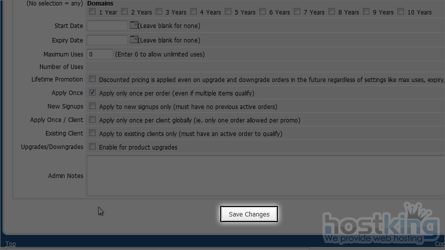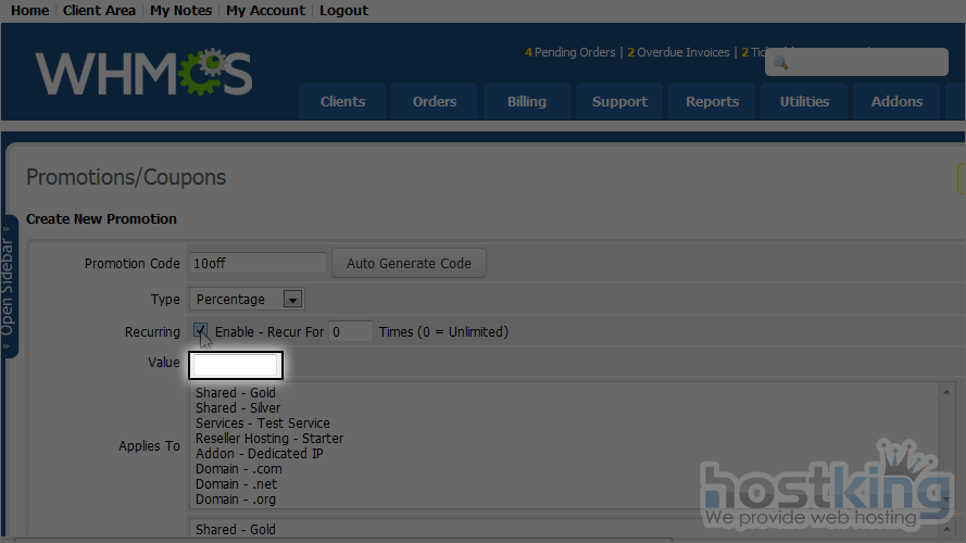 8) Select if this promotion is recurring. WHMCS 5 also give you option to set how many times recur should be occured.