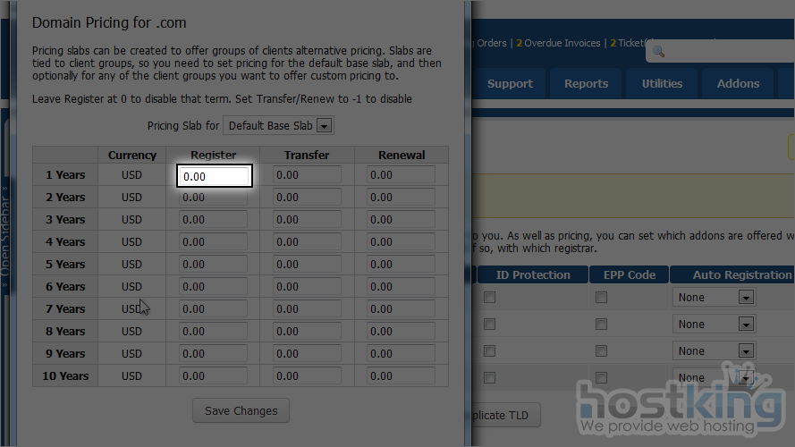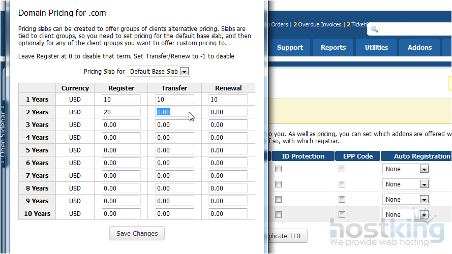 For each term you wish to offer the domains of this type, specify the price of registrations, transfers and renewals. Registrations can be left as 0 to disable everything for that term; the other two should be set as -1 to disable each.