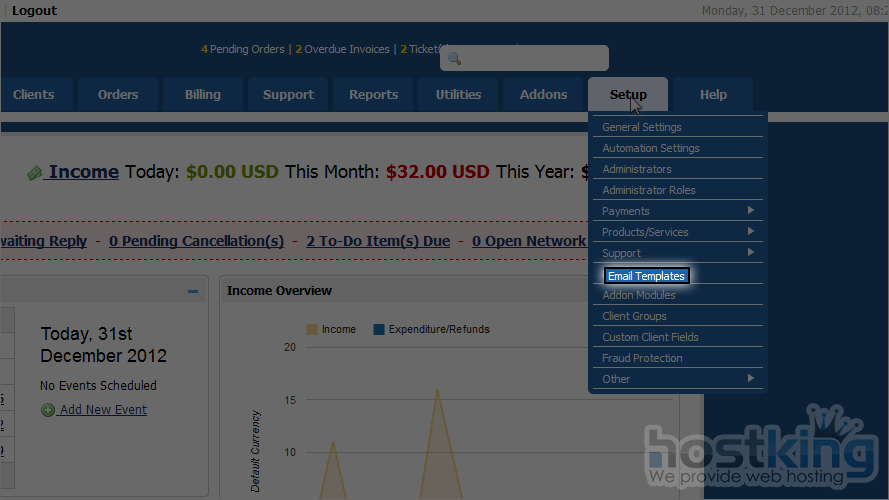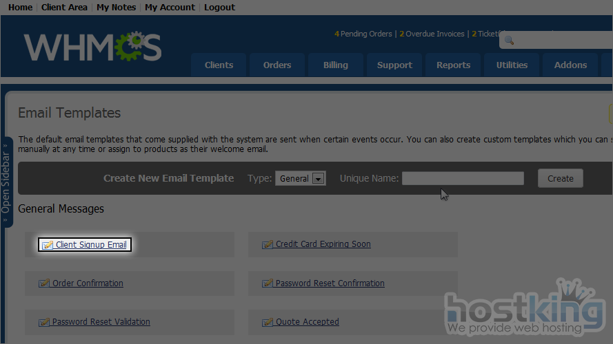 Email templates are used by WHMCS when certain events occur. You can modify the default templates or create custom ones here.