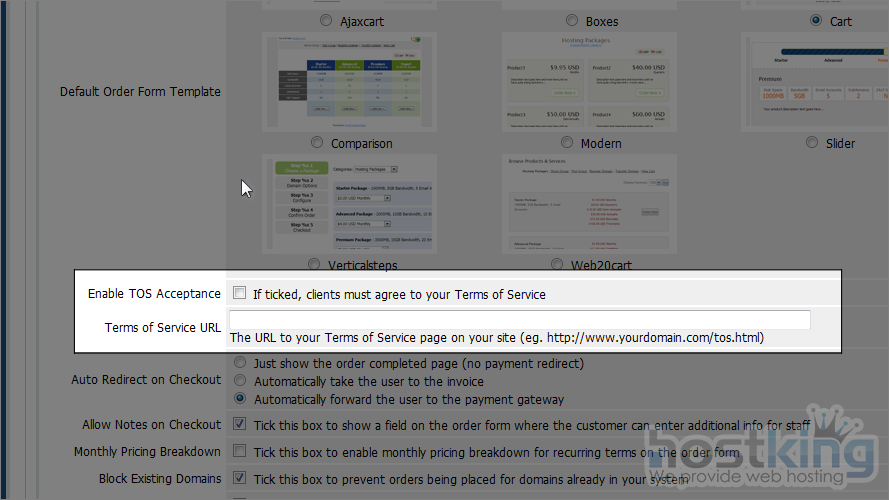 7) More web hosts will probably want to require their clients' acceptance of the terms of service. Be sure to enter the URL to your TOS page in the box below.