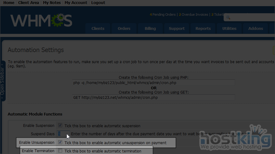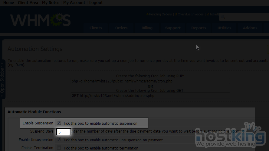 In order for the automation settings to work, you must have the WHMCS cron job set up. For details on how this is done, watch the tutorial earlier in this series.
