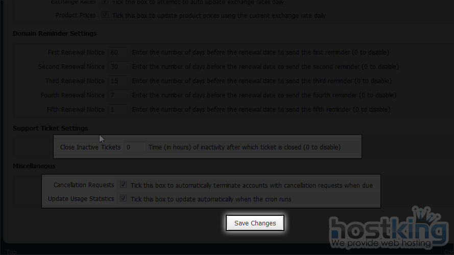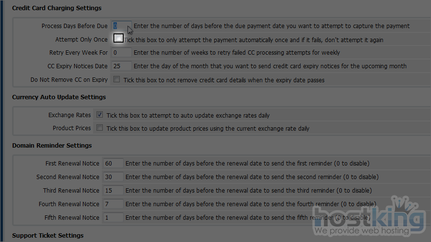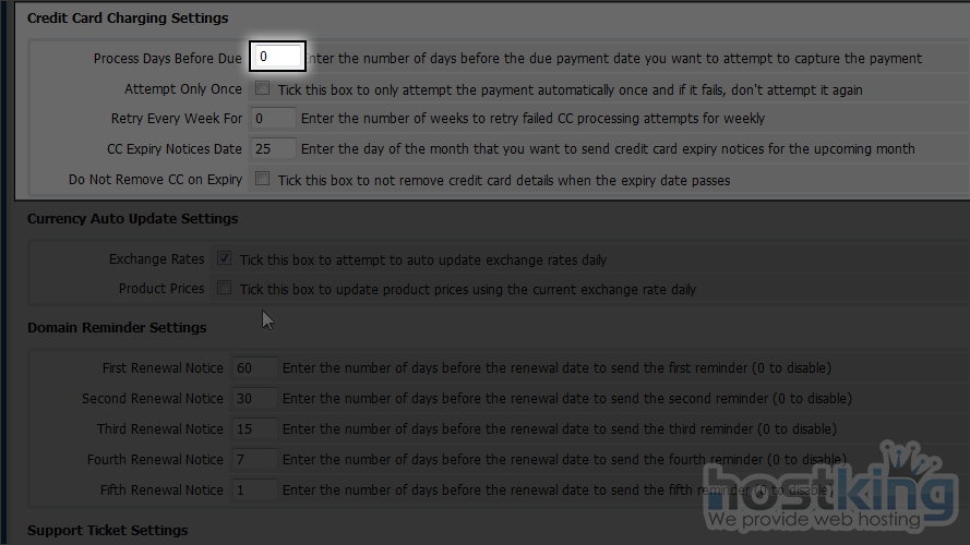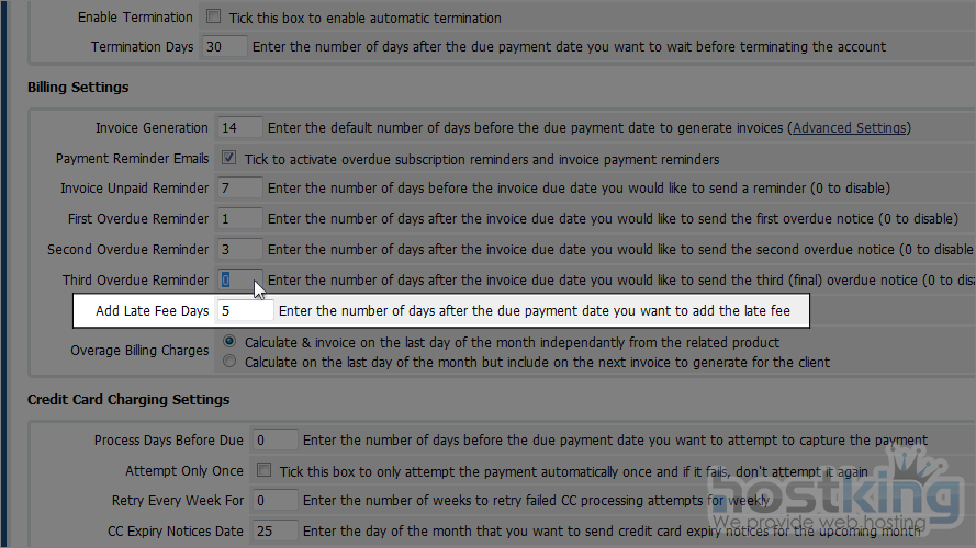 The first box of settings controls automatic account suspension and termination. Note that this will only function properly once WHMCS has been set up to work with your control panel(s).
