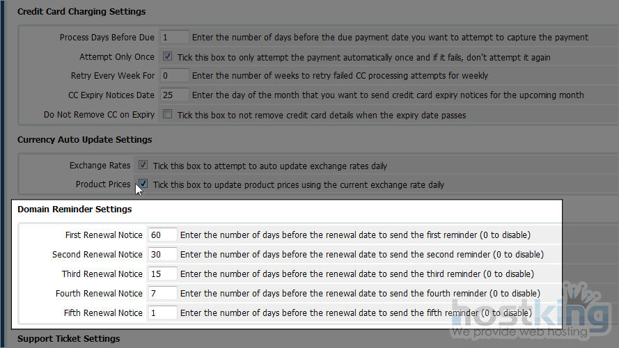 The domain reminder settings allow you to specify the frequency at which notices will be sent prior to a domain name's renewal date. You can send up to five notices.