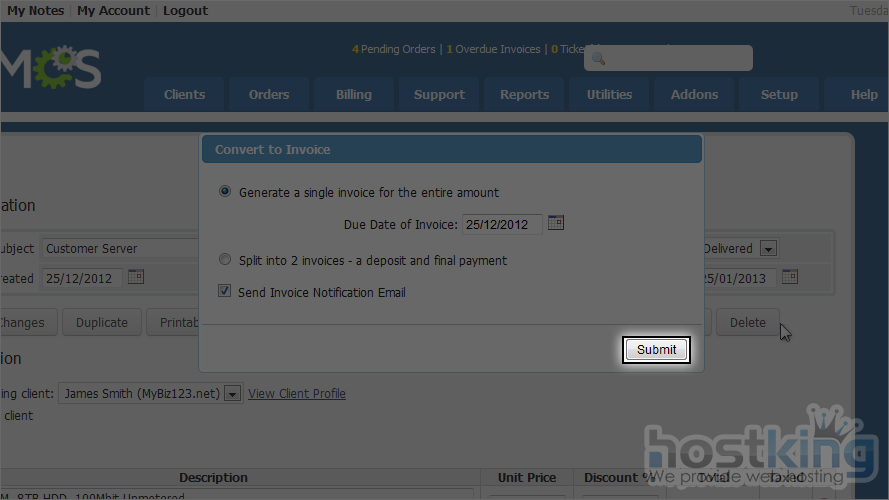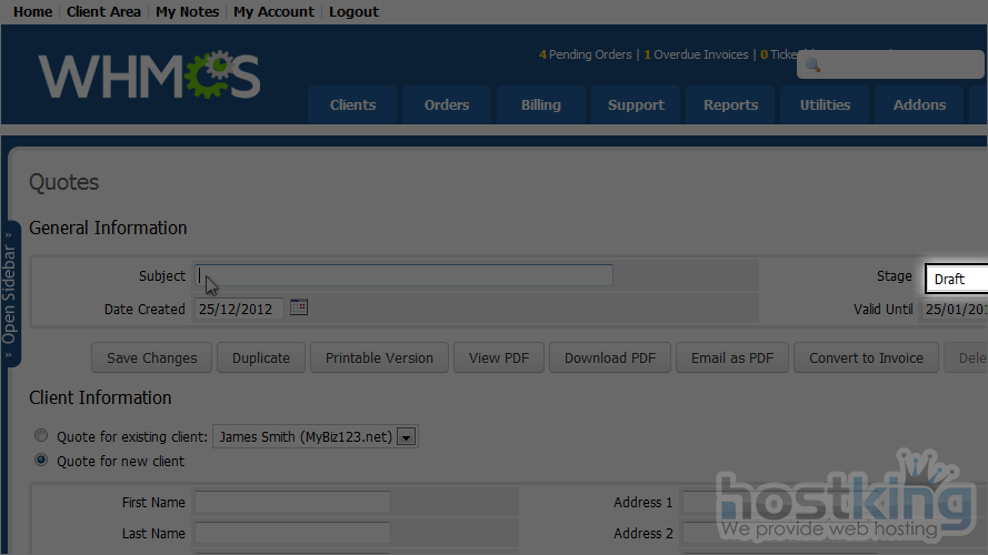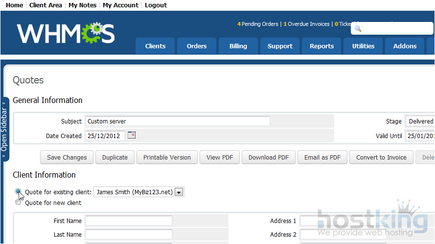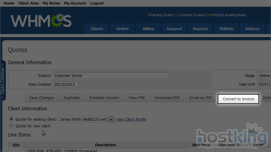 Often, a client will want a customized order instead of your standard offerings. With WHMCS, you can give them an initial quote that can later be converted to an invoice.