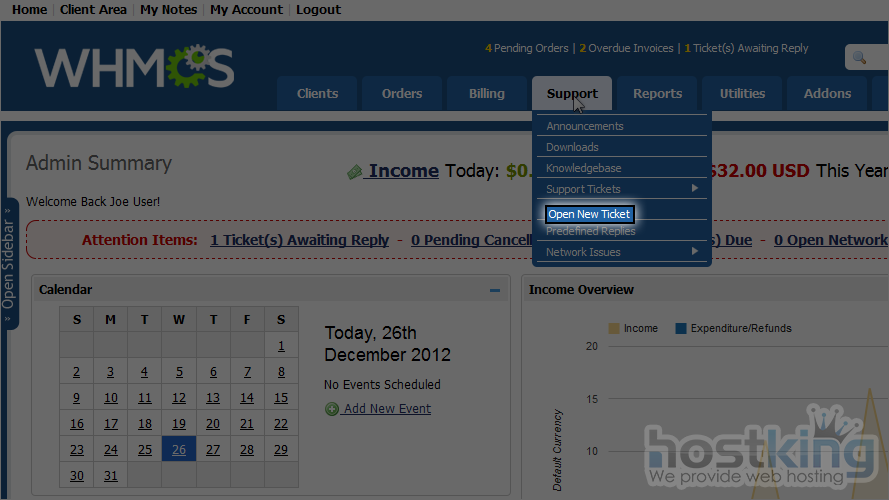 How to open a new support ticket as an admin in WHMCS